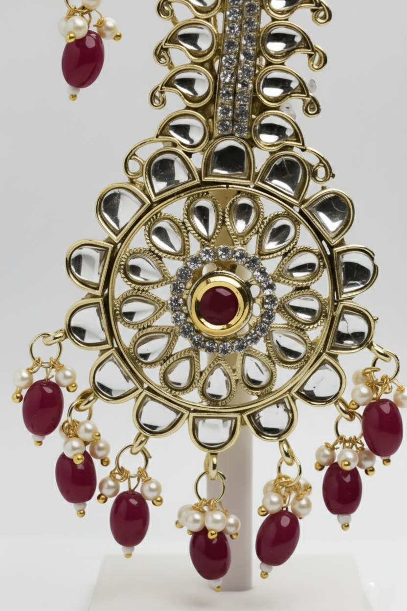 This premium dulha sehra kalangi features a royal gold kundan design with deep red beads and pearl hangings. Perfect for groom sehra, sherwani, pagdi, or safa styling. Add a rich traditional touch to your wedding look.