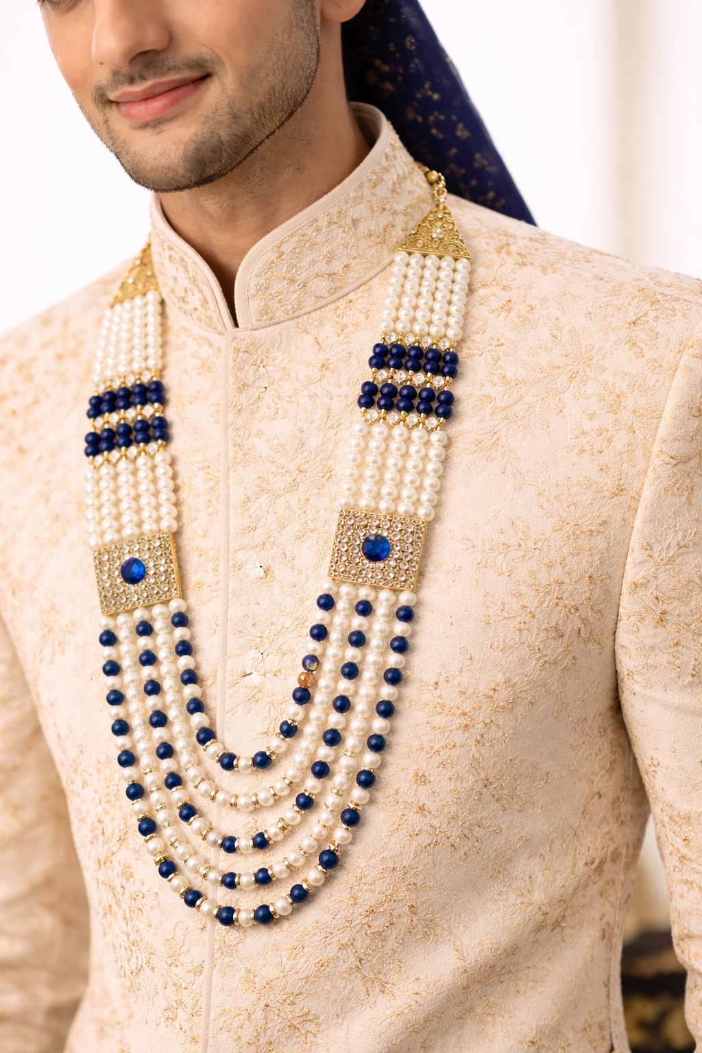 Royal Blue & White Pearl Groom Mala for Men | Multi-Layer Wedding Necklace with Kundan Brooch | Sherwani Jewellery Haar (Gold Finish)