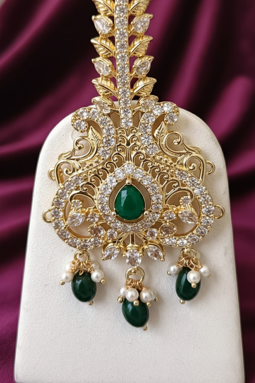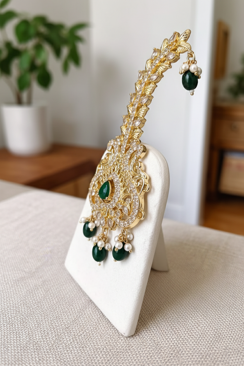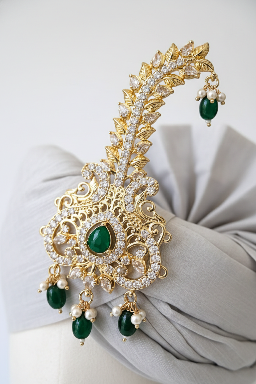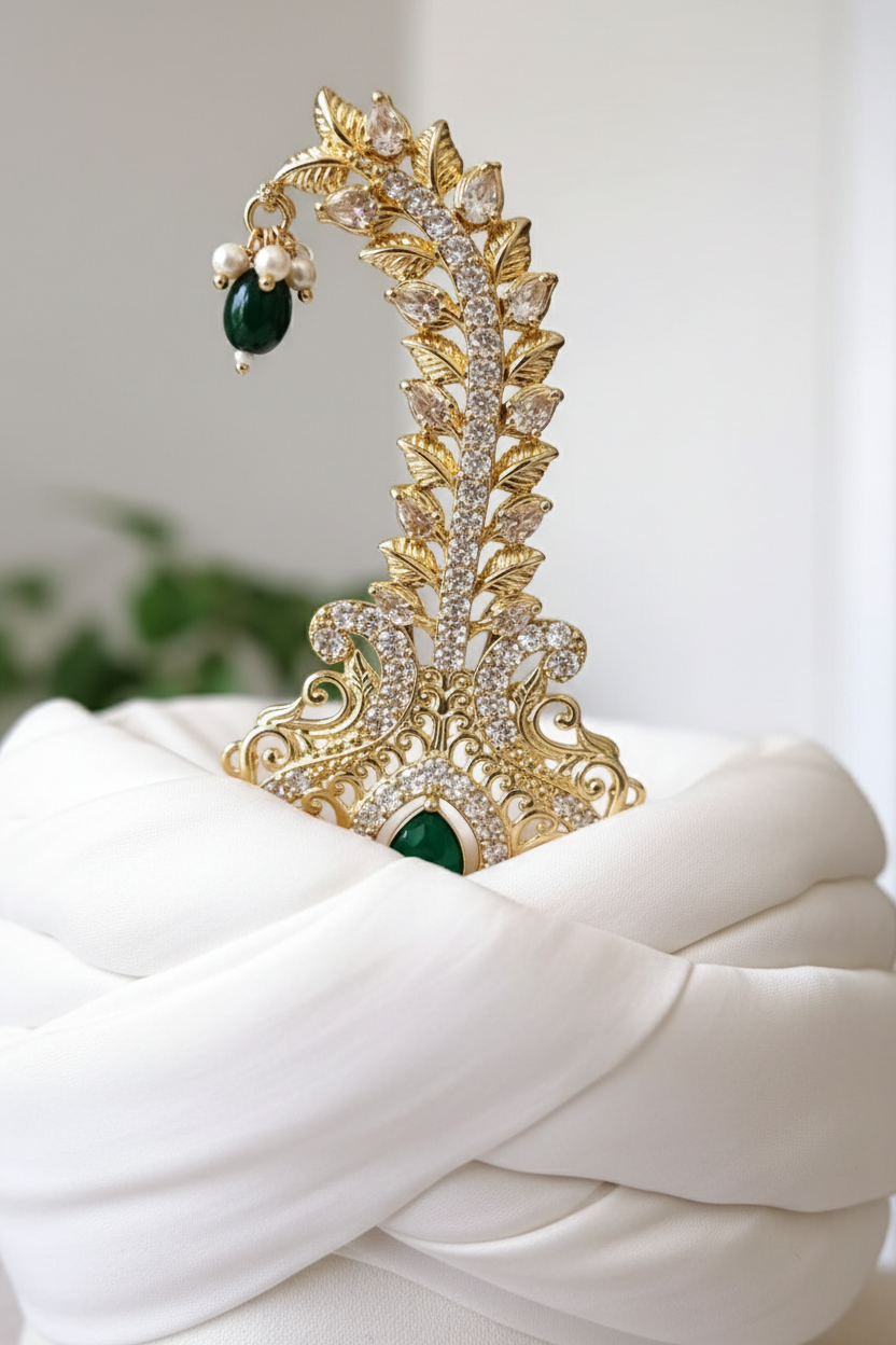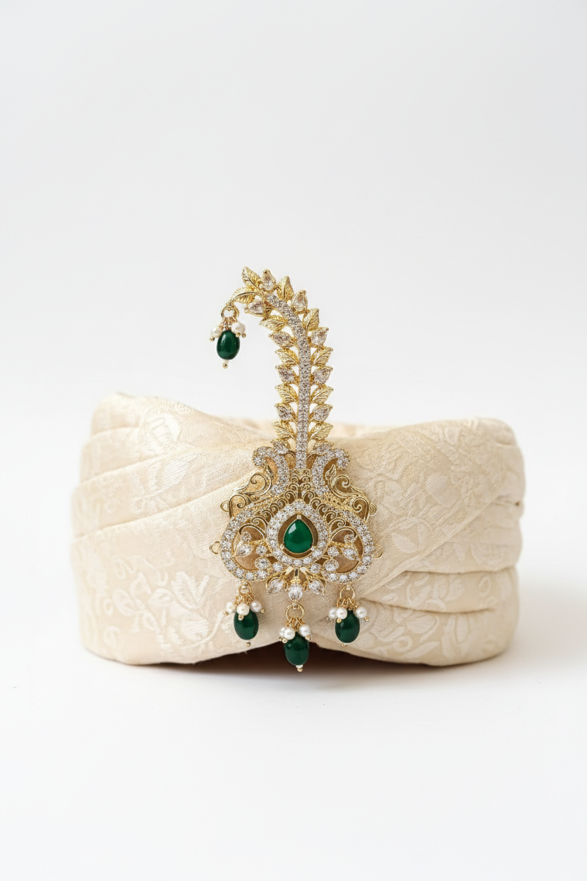 This Royal Emerald Green Designer Kalangi is crafted to give a grand and majestic look to groom attire. Adorned with sparkling kundan stones, a rich emerald green center stone, and elegant green bead drops with pearls, this kalangi reflects royal heritage and fine craftsmanship.