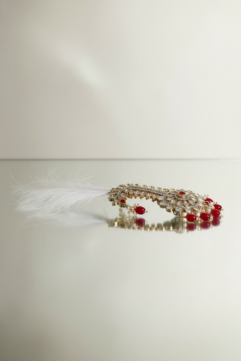 Its intricate gold-toned design enhances the elegance of pagdi, safa, and sherwani styling, making it a perfect accessory for weddings, baraat, and ceremonial occasions. Lightweight yet statement-making, this kalangi completes the groom’s royal look with sophistication and charm.