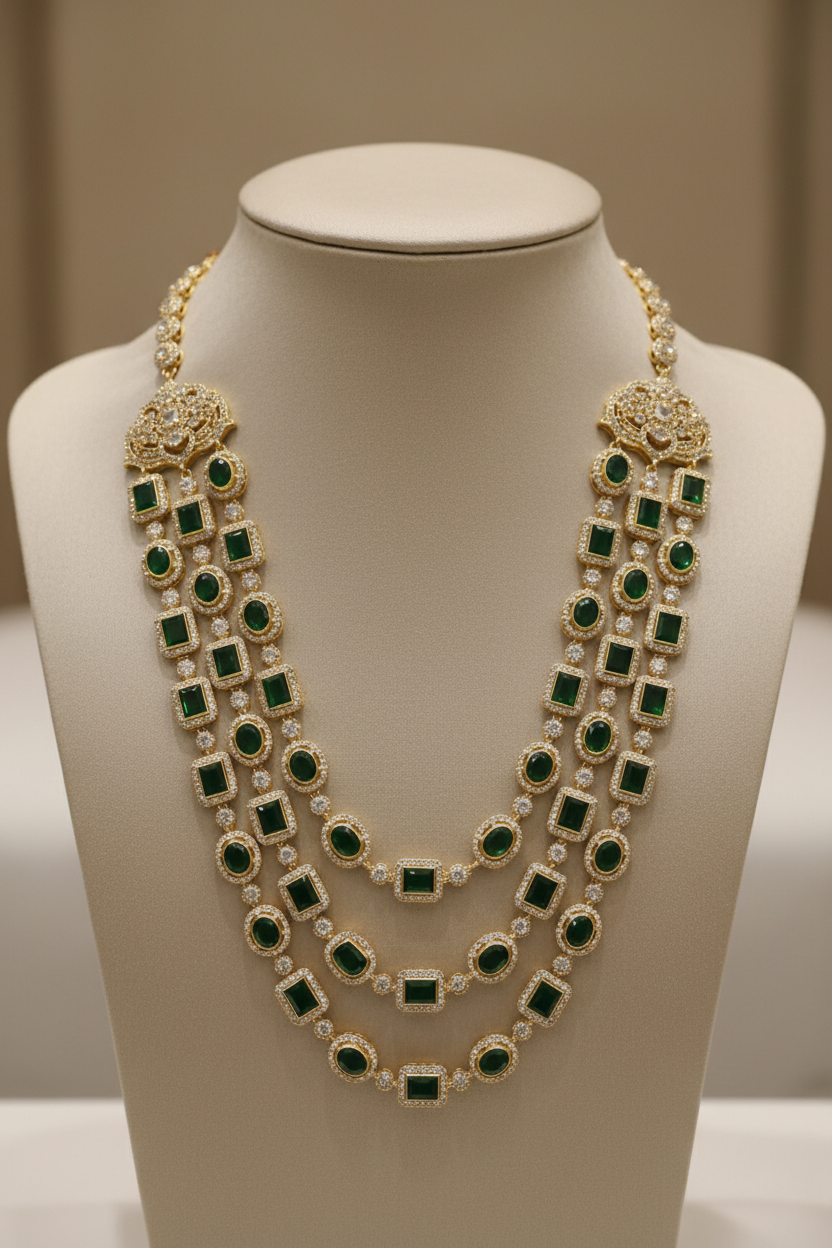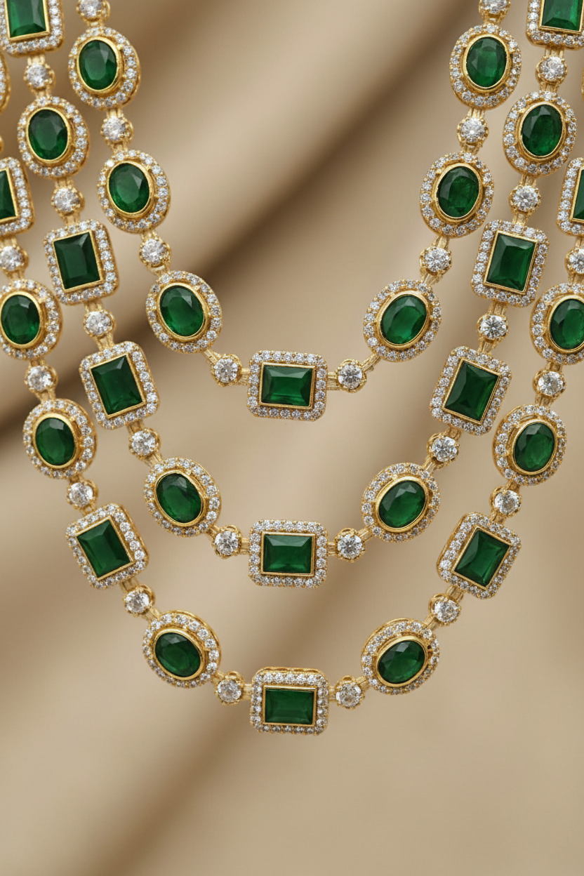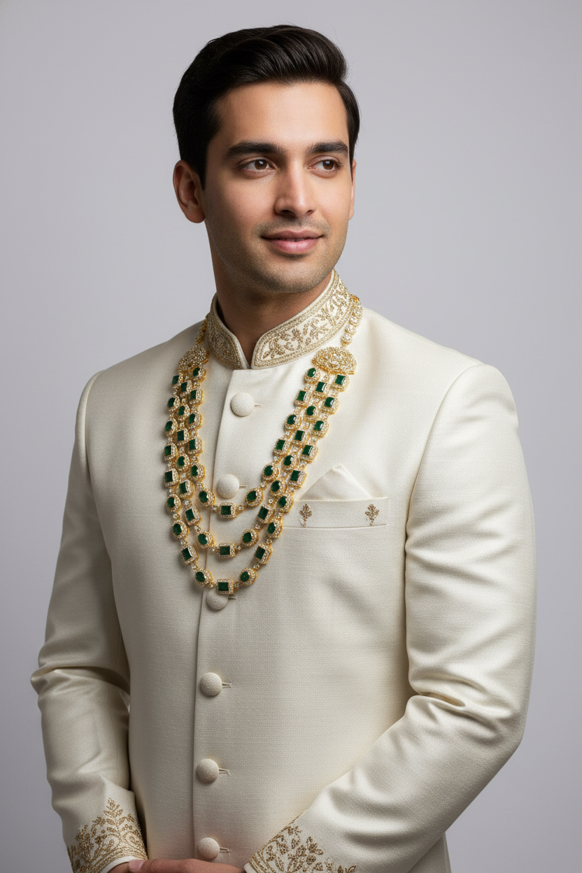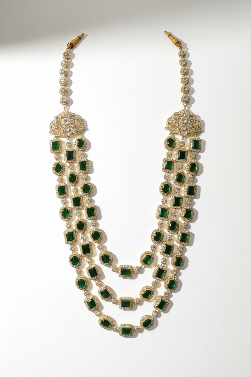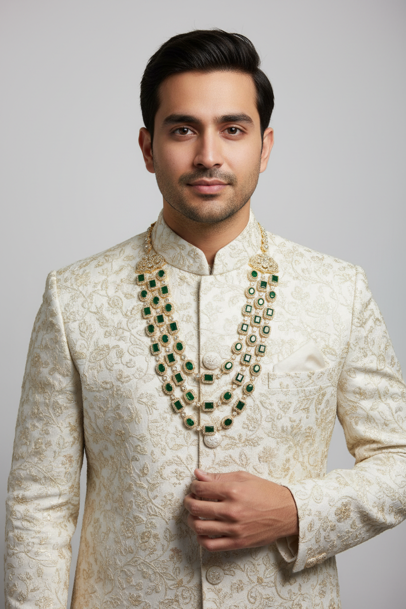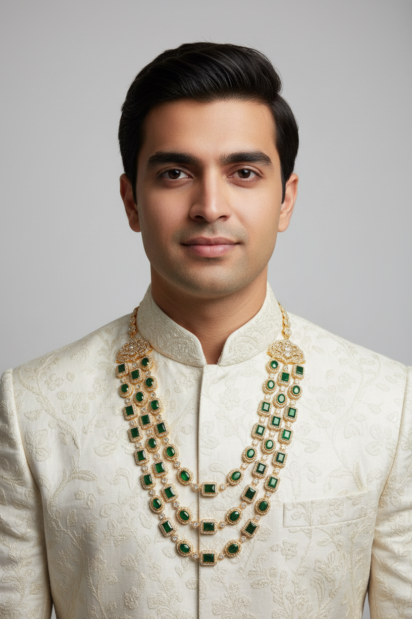 This Royal Emerald Green Kundan Groom Mala is specially designed to enhance the grandeur of traditional groom attire. Featuring multiple layers of rich emerald green stones set in elegant gold-toned kundan frames, this mala creates a majestic and royal look.