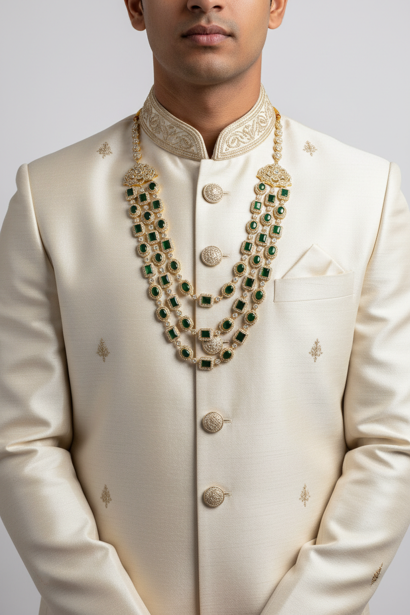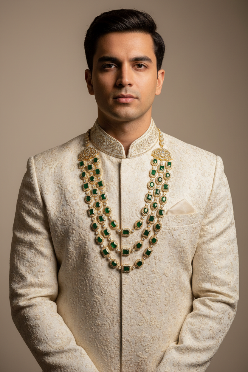 Royal emerald green kundan groom mala designed to add grandeur and elegance to men’s wedding and traditional attire.