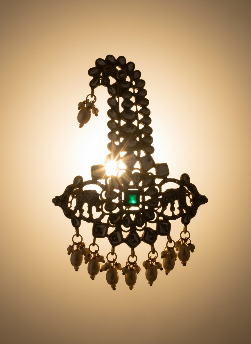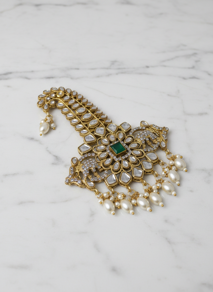 Give your wedding attire a regal touch with this stunning Groom’s Kalangi Brooch, beautifully crafted in premium gold-finish metal. Designed with intricate Kundan work, this kalangi features a detailed floral centerpiece and an elegant emerald stone that adds richness to the entire look. The hanging emerald drop and pearl accents enhance its royal personality, making it perfect for sherwani, safa, or turban styling.