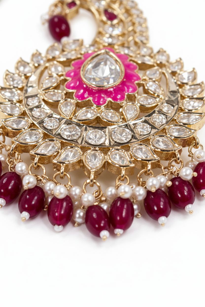 This kalangi features a premium gold-tone base adorned with sparkling kundan stones, arranged in a classic circular motif that reflects timeless Indian craftsmanship. The centerpiece is highlighted with a vibrant ruby-red accent, giving it a luxurious and eye-catching appeal.