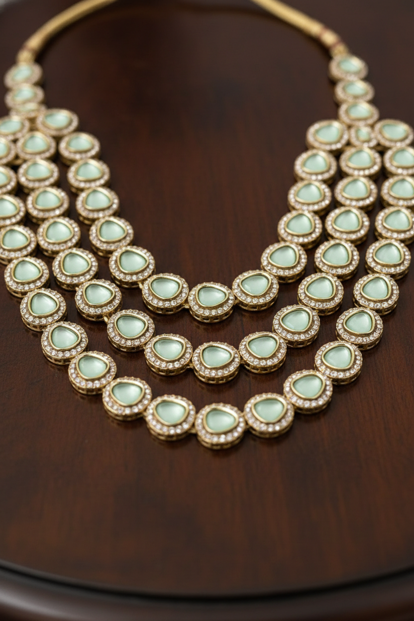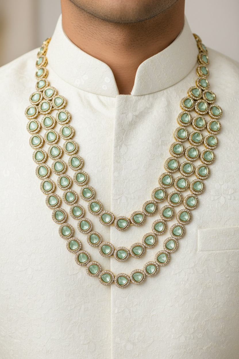 This Royal Mint Green Kundan Groom Mala is specially designed for men to enhance traditional wedding attire. Crafted with multiple layers of mint green stones set in elegant gold-toned kundan frames, this mala adds a regal and majestic touch to groom wear.