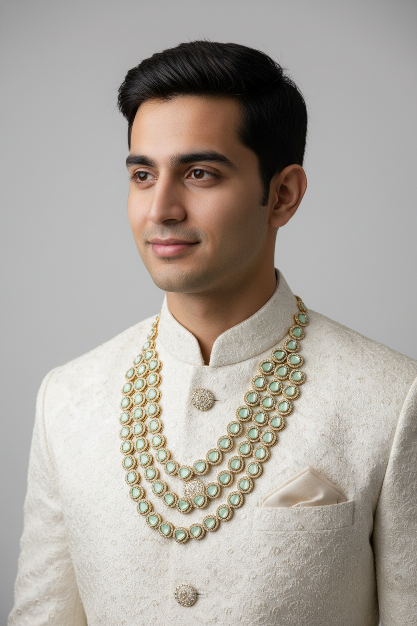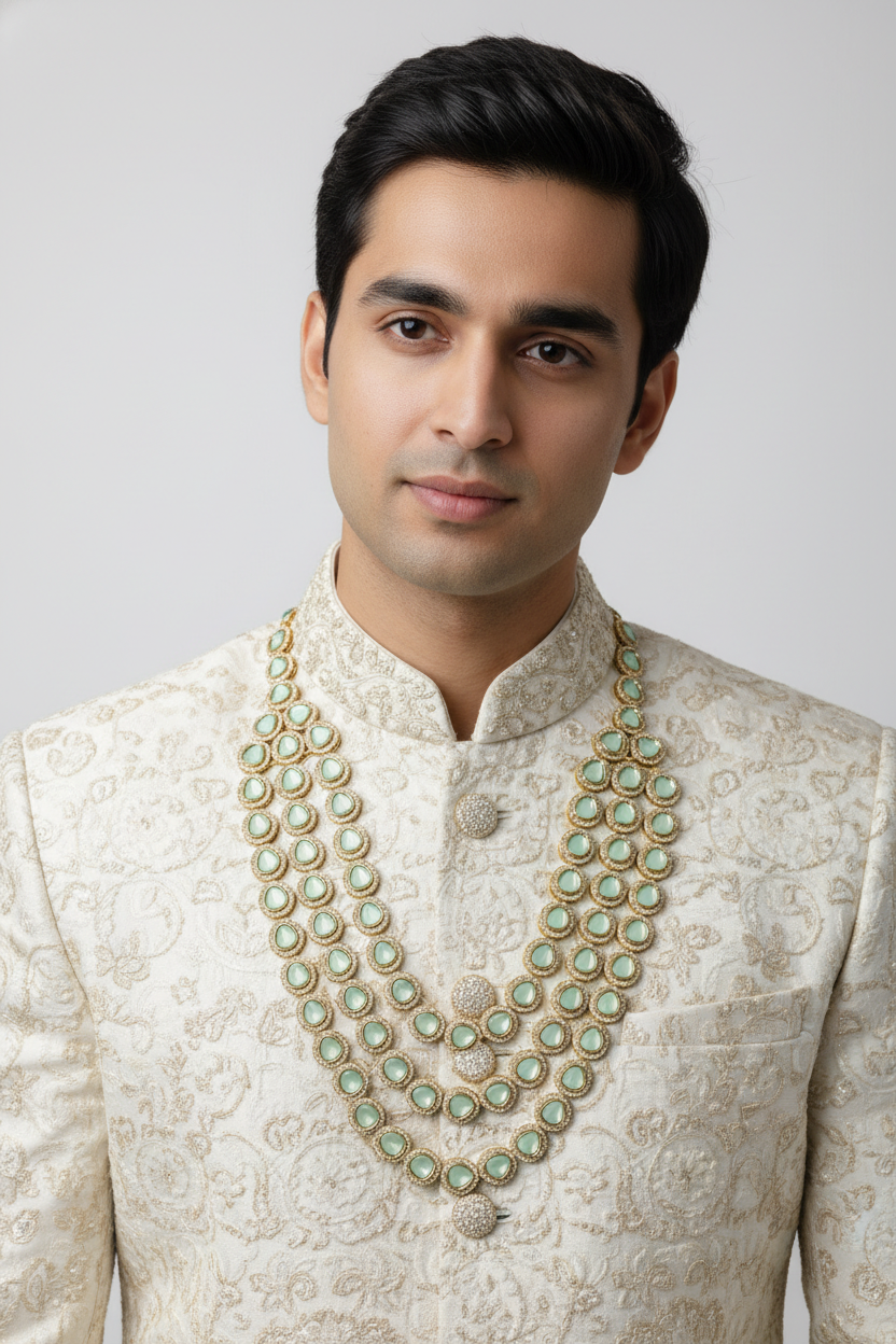 Its long layered design pairs perfectly with sherwani, achkan, and royal wedding outfits, making it an ideal choice for weddings, engagements, and ceremonial occasions.