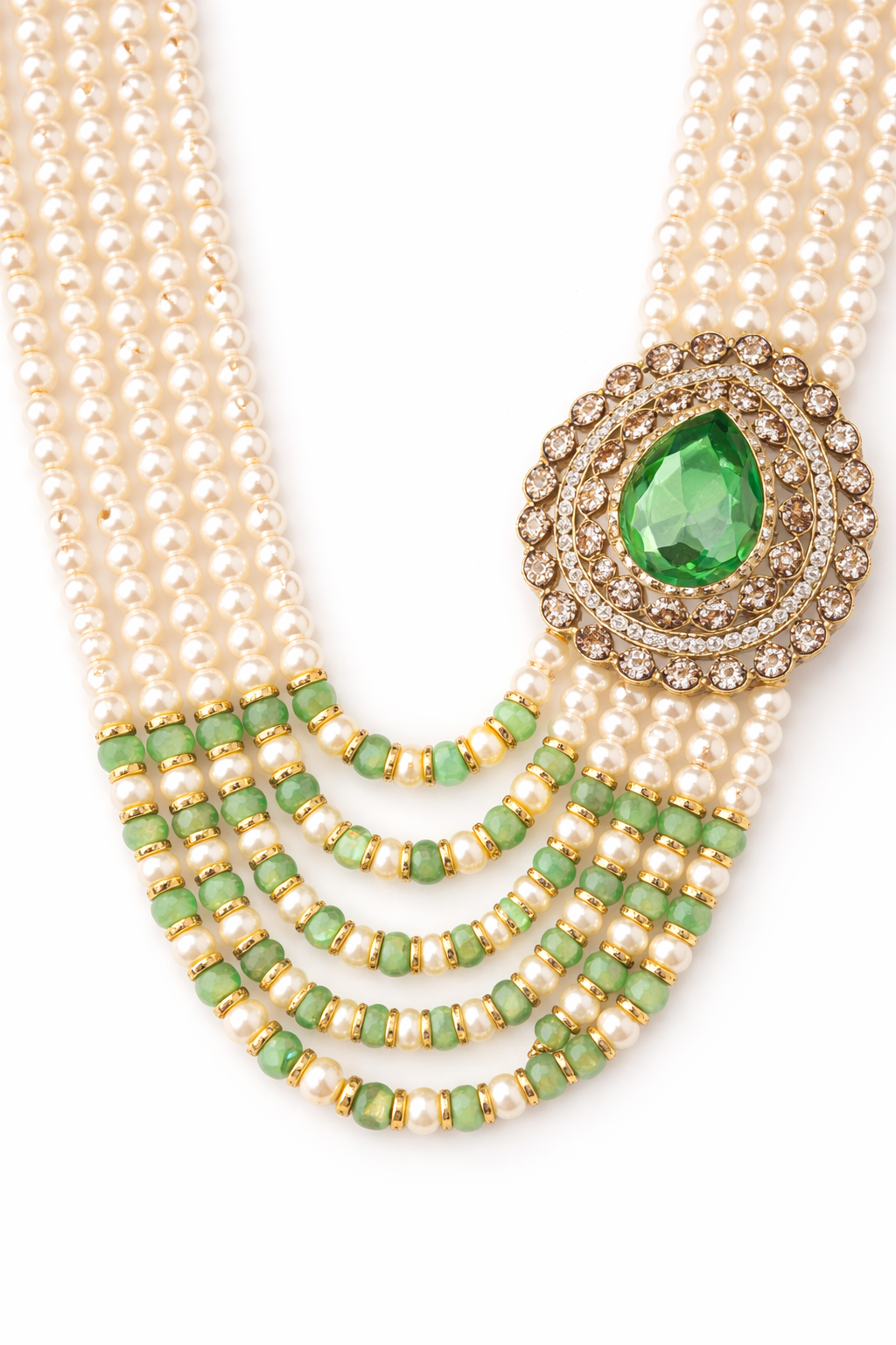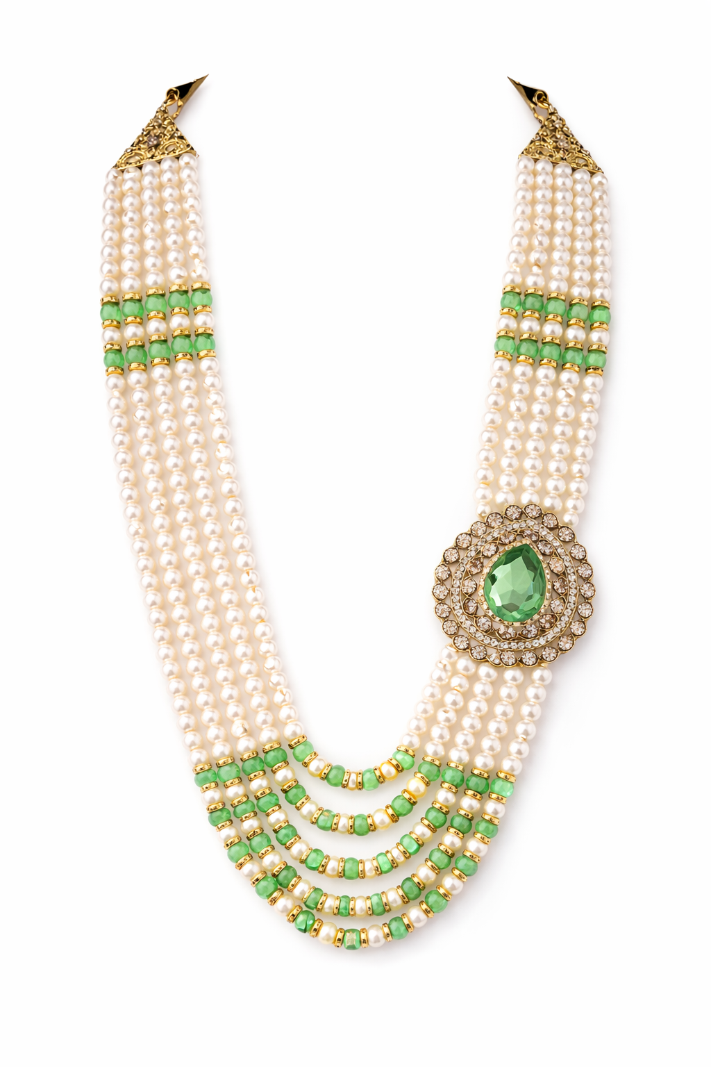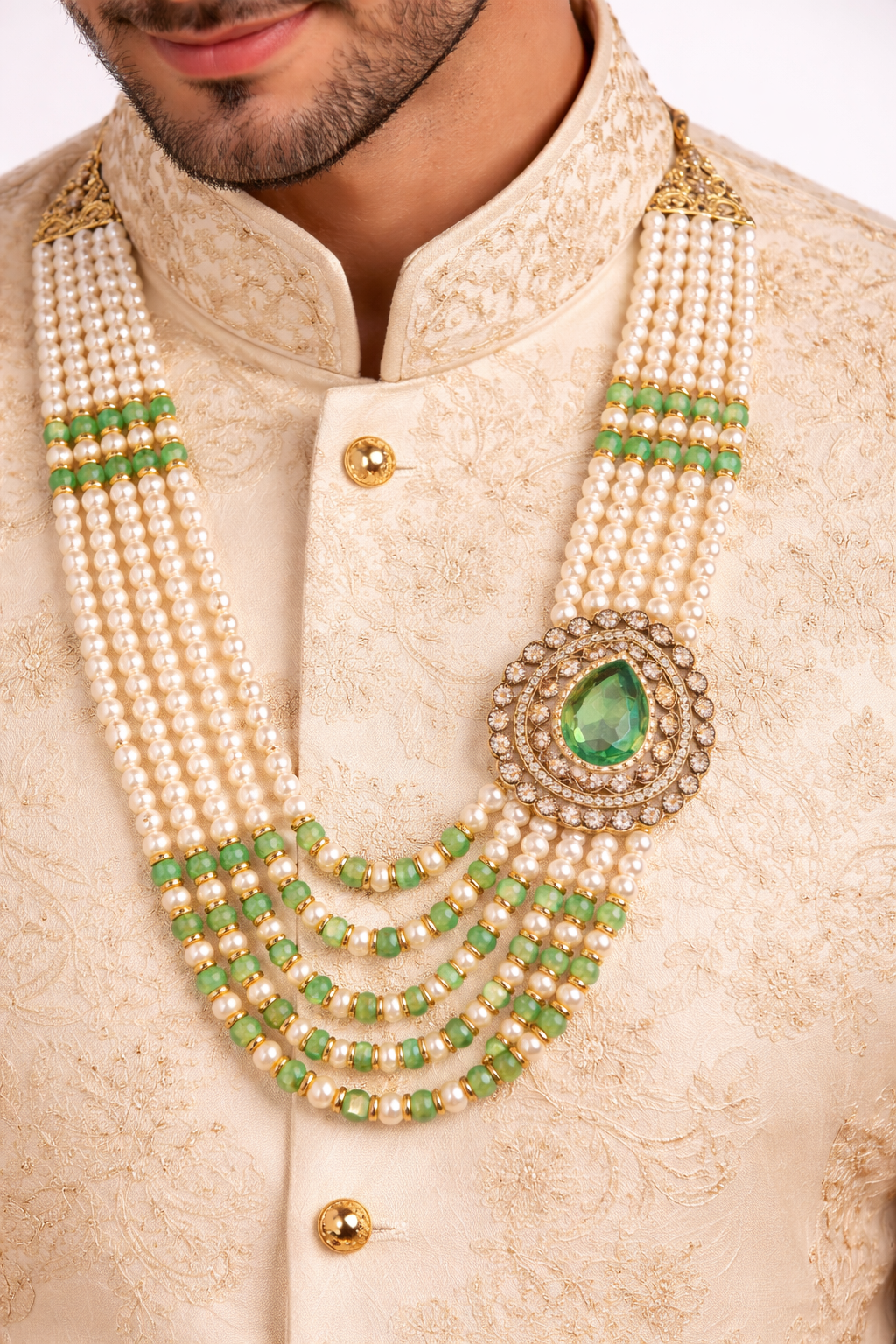 Royal multi-layer pearl mala for men with pista green bead detailing and elegant green stone brooch. Perfect for weddings, baraat, and traditional functions.