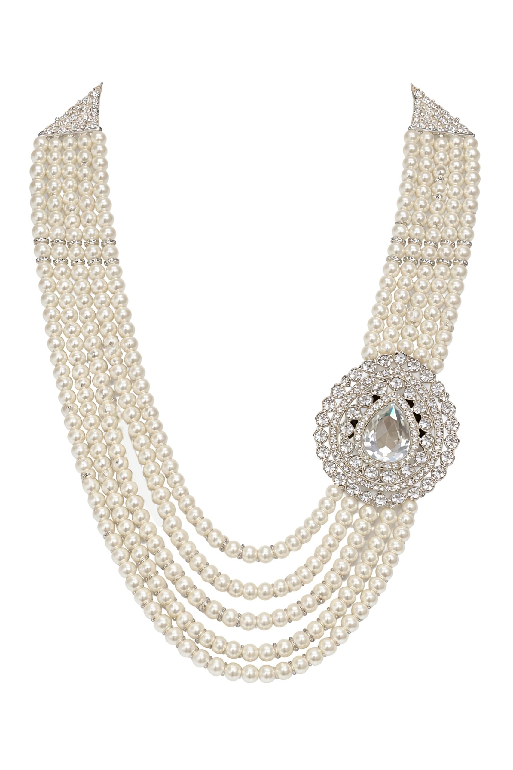 Royal Pearl Groom Mala for Men with White Stone Brooch | Wedding Sherwani Mala | Dulha Haar Multi Layer Pearl Necklace (Silver Finish Look)