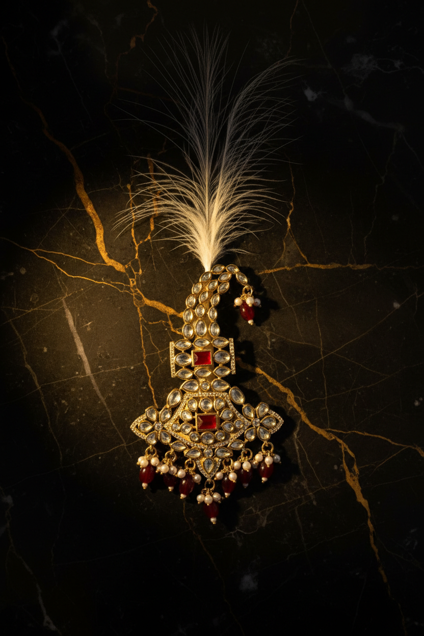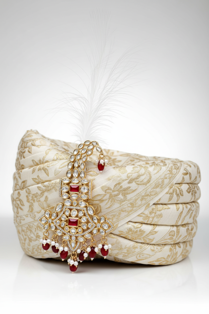 This Royal Red Stone Kundan Feather Kalangi is crafted to enhance the royal charm of groom attire. Designed with premium kundan stones and highlighted with elegant rectangular red stones, this kalangi reflects traditional craftsmanship with a luxurious gold-toned finish.
