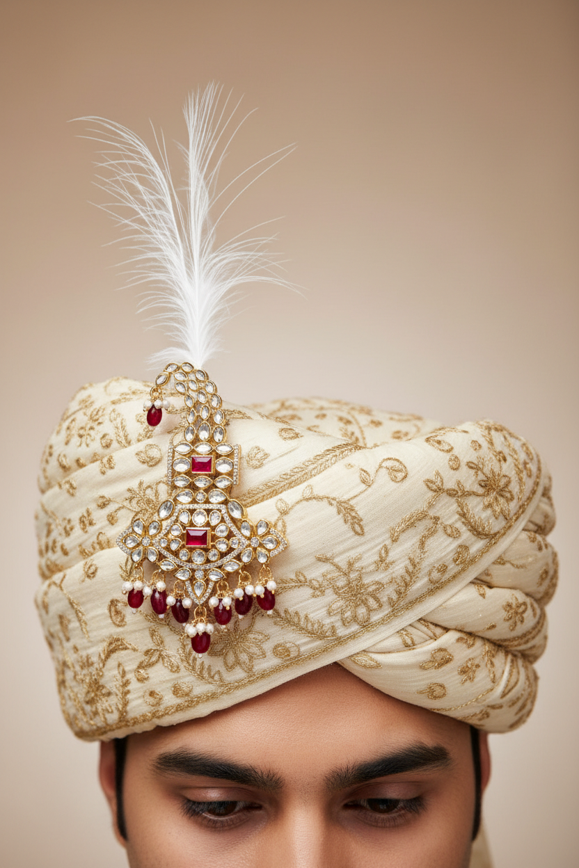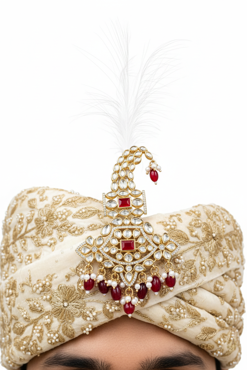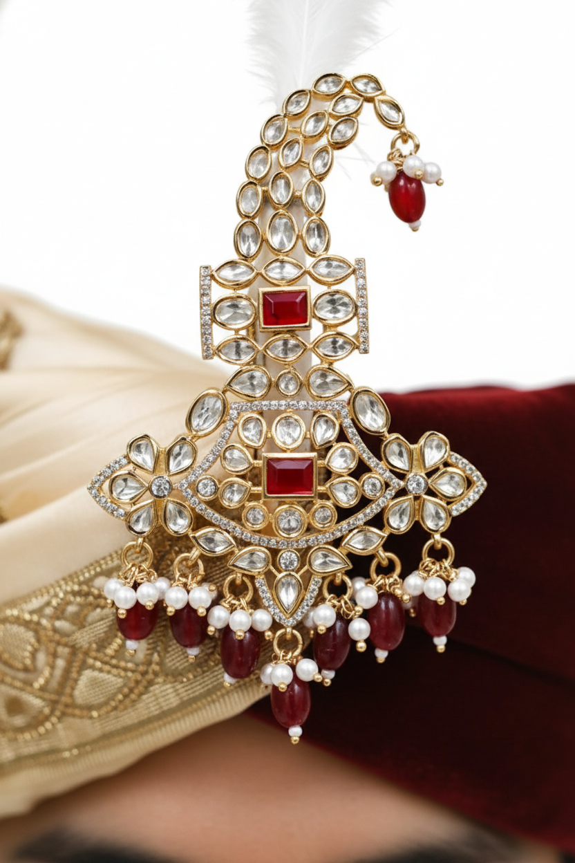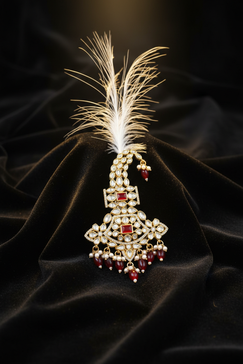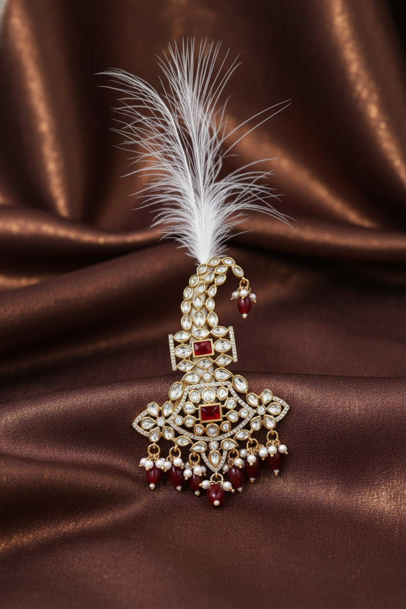 Royal red stone kundan feather kalangi designed to add majestic elegance and traditional charm to men’s wedding groom attire.