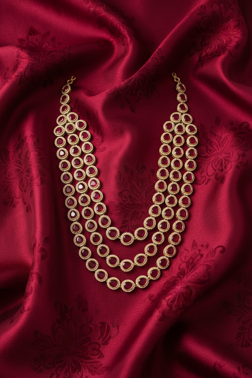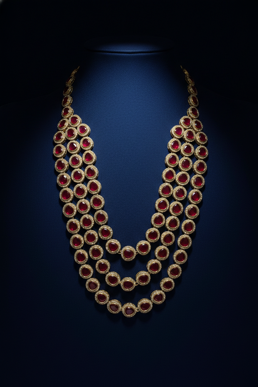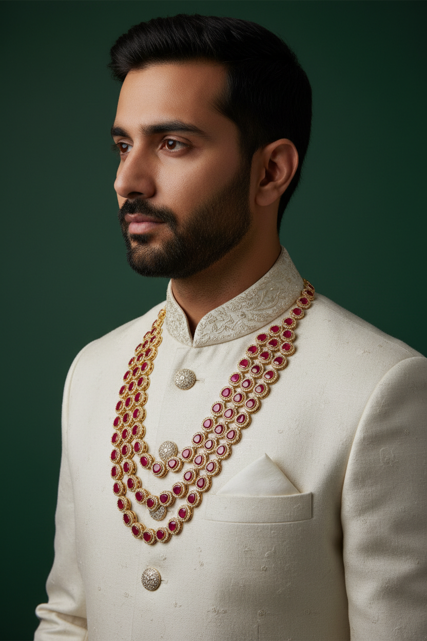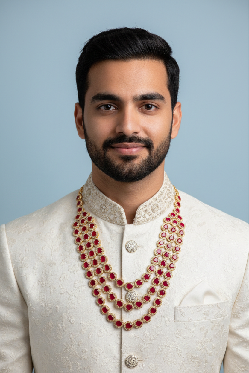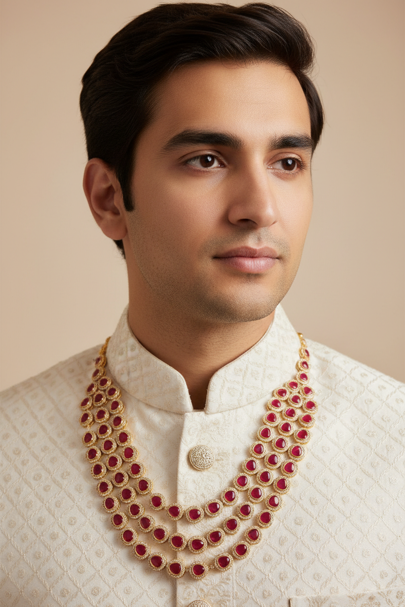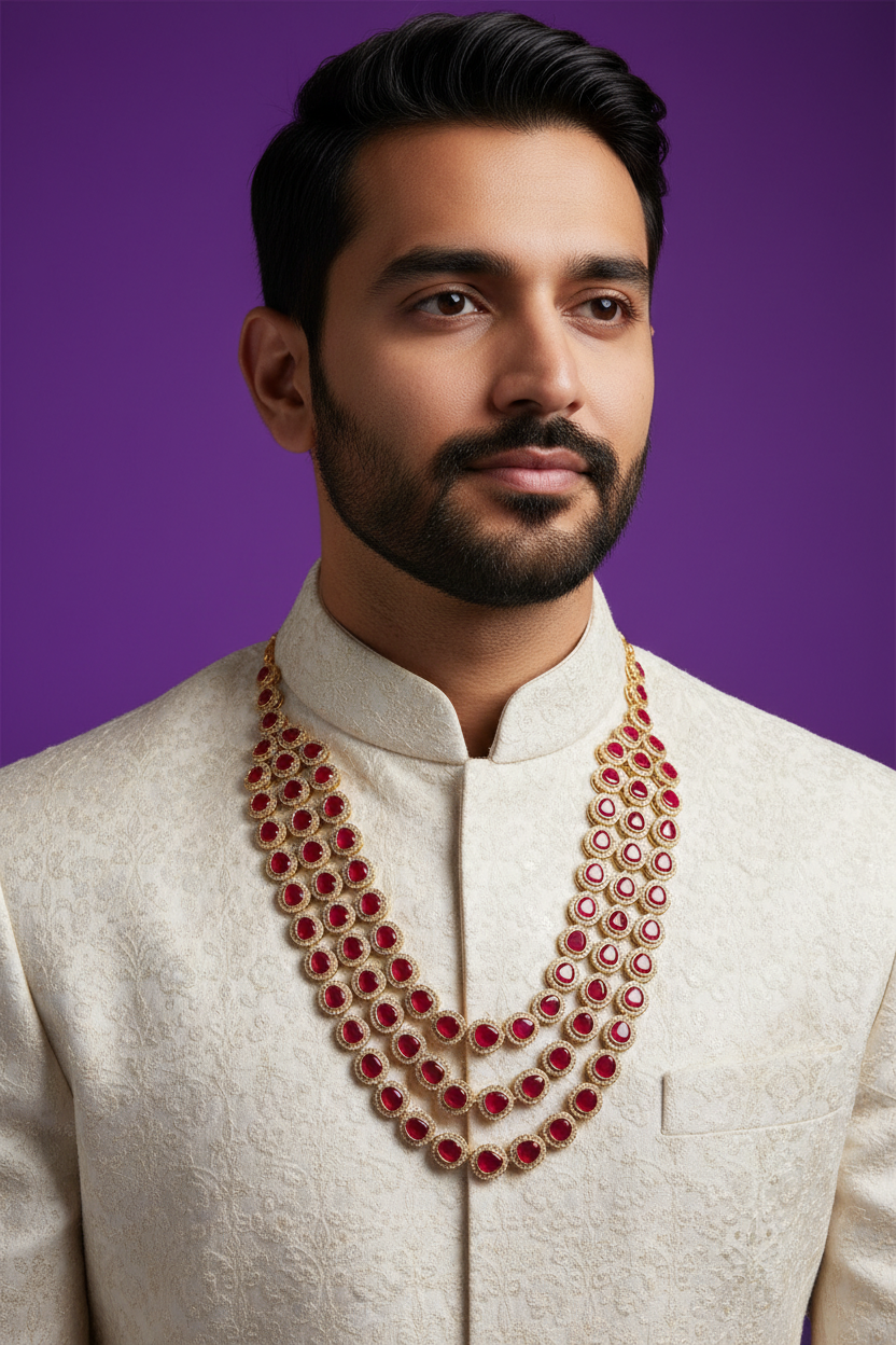 Royal ruby red layered groom mala necklace crafted to add majestic elegance and bold royal charm to men’s wedding attire.