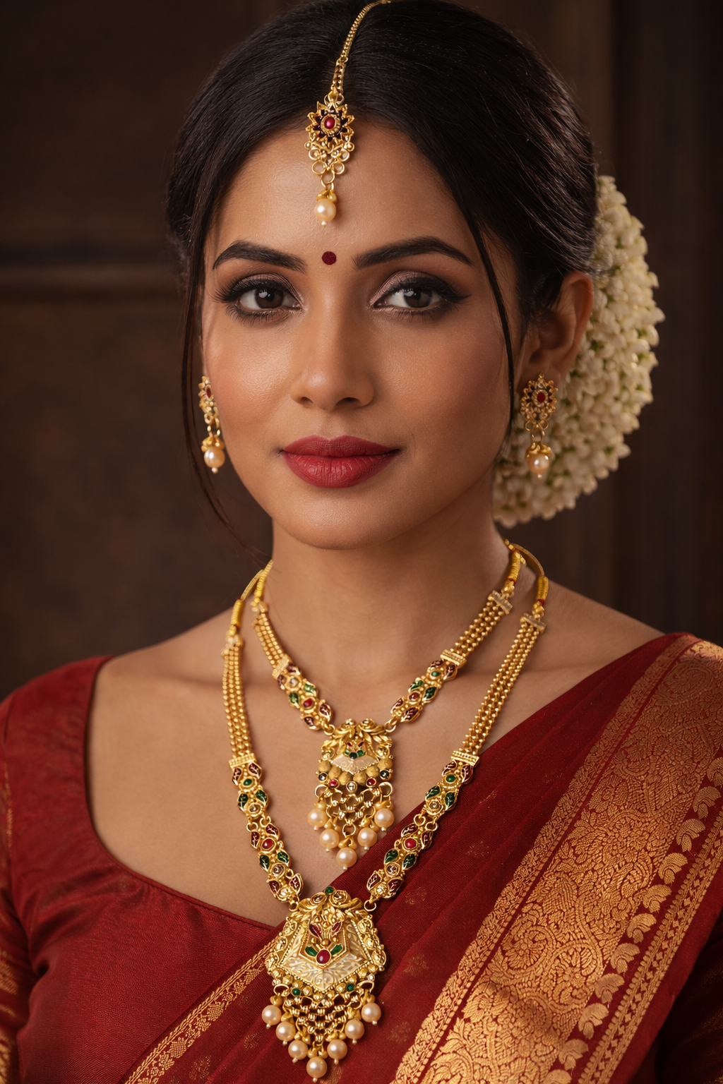 This set features a double-layer necklace (haar) designed with intricate temple-style patterns that reflect traditional Indian craftsmanship. The combination of green and red stones adds a vibrant and royal touch, making it perfect for bridal and festive wear.
