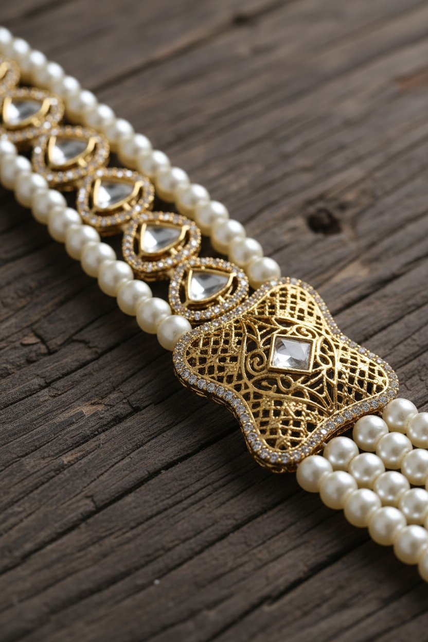 Add timeless elegance to your wedding ensemble with this Royal Multi-Layer Pearl Groom Necklace, crafted to enhance the traditional charm of Indian groom attire. Featuring multiple strands of lustrous pearls, this necklace is beautifully finished with a detailed kundan-style clasp that adds a regal touch to the overall design.