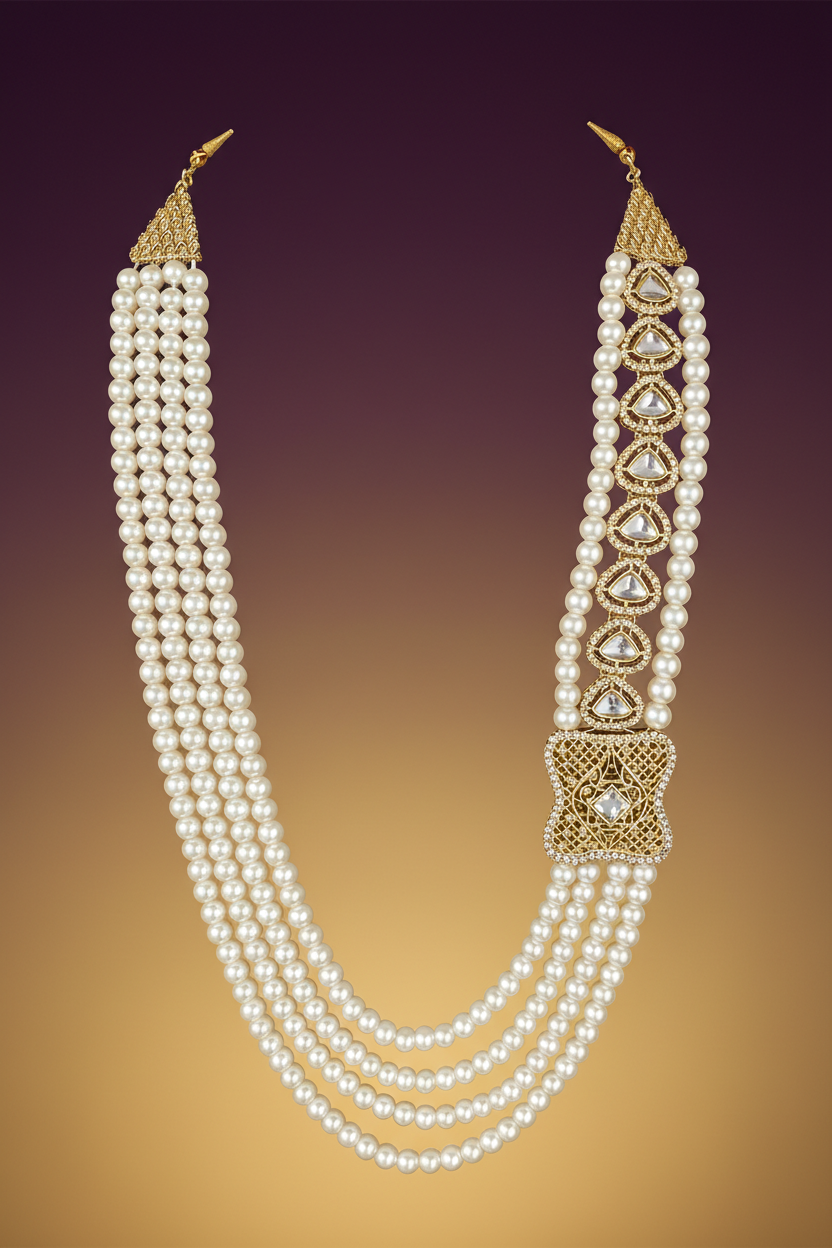 Royal multi-layer pearl groom necklace featuring a refined kundan-style clasp. Designed to complement sherwanis and traditional wedding attire with timeless elegance and comfort