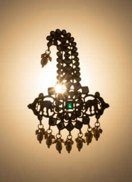 A royal groom kalangi brooch featuring a stunning green enamel base, gold-toned kundan work, and pearl bead hangings. Perfect for enhancing the groom’s sehra, sherwani, or safa with a royal and traditional look.