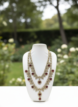 Royal ruby red layered groom mala necklace crafted to add majestic elegance and bold royal charm to men’s wedding attire.