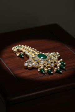 This premium dulha sehra kalangi features a royal gold kundan design with deep Green beads and pearl hangings. Perfect for groom sehra, sherwani, pagdi, or safa styling. Add a rich traditional touch to your wedding look.
