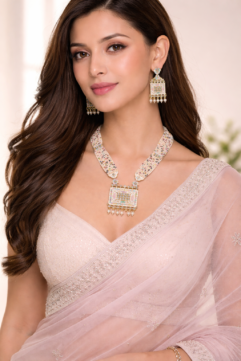 Complete your bridal look with this elegant gold-plated jewellery set featuring a double-layer necklace, matching earrings, and maang tikka. Designed with traditional temple patterns, colorful stones, and pearl drops, it’s perfect for weddings and festive occasions.
